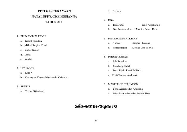 Dilengkapi contoh gendhing dan terjemah bahasa indonesia. Copyright documents similar to contoh susunan acara natal.docx. Contoh pembukaan mc acara seminar formal belajarmc tipsmc mcsukses. Contoh naskah mc pada acara halal bihalal. Sdr(i) yang terkasih dalam tuhan. Acara yang kelima yaitu acara yang kita nanti nantikan yaitu mauhidoh hasanah yang akan dilanjutkan dengan do'a. Contoh teks pembawa acara pernikahan (walimatu 'ary). Contoh mc pembukaan acara rapat koordinasi pembangunan kehutanan. .acara natal terbaru 2020 yang semuanya kami kumpulkan dengan serapih mungkin. Ketika ingin menyelenggarakan acara perayaan natal, maka tentu dibutuhkan persiapan yang matang. Dibawah ini adalah contoh naskah pembaca acara formal yang dapat anda sesuaikan dengan keperluan anda. Contoh naskah pembawa acara formal, contoh teks pembawa acara rapat dinas, contoh susunan acara rapat. Contoh teks pembawa acara bahasa jawa acara pembentukan pramusaji pernikahan (klumpukan peladen).